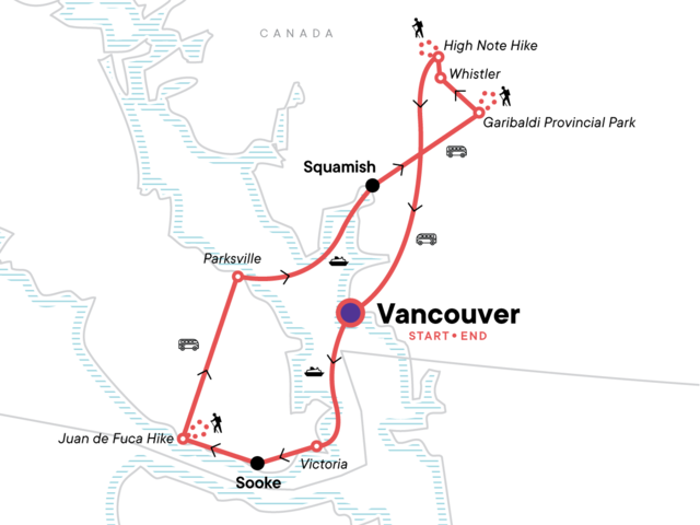 Your Welcome Moment: Welcome Meeting - Meet Your CEO and Group. Ferry ride from Vancouver to Sooke. An afternoon of hiking in East Sooke Provincial Park. A trek along a portion of the Juan de Fuca trail. Canoe or kayak rental on Cowichan Lake. Ferry from Nanaimo to Horseshoe Bay. A hike up The Stawamus Chief train. A visit to Garibaldi Provincial Park and a hike to the Elfin Lakes. A ride up the Whistler Gondola to hike the High Note trail. All transportation between destinations.