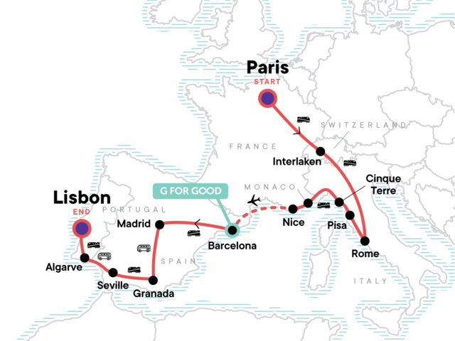 Your Big Night Out Moment: Lisbon. Visit to the Leaning Tower of Pisa. Cinque Terre park fee with unlimited train rides and CEO-led hike. Visit to Monaco. Tapas bar crawl (Granada). Orientation walks in Paris, Interlaken, Rome, Barcelona, Madrid, Granada, Seville and Lisbon.