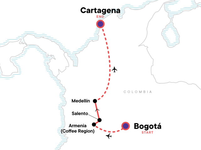 Your Foodie Moment: Coffee Farm Tour, Calarcá. Hacienda stay. Valle de Cocora hike. Medellín city tour. Cartagena orientation walk. Internal flights. All transport between destinations and to/from included activities.