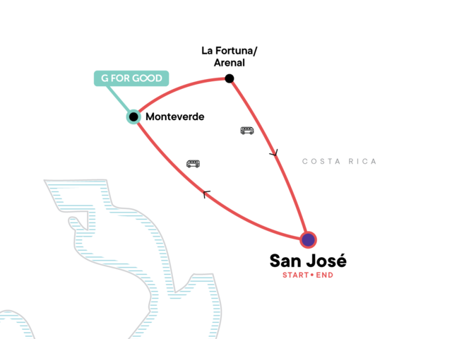 Drive along winding roads to the quaint town of Monteverde, surrounded by cloudforest. Enjoy free time in the afternoon to explore, and opt to fly across canopy ziplines, walk across suspended bridges through the forest canopy, or go horseback riding in the hills. Enjoy a G for Good farm experience and coffee tour.