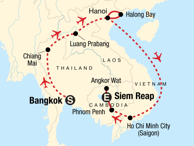 Your Discover Moment: Luang Prabang. Arrival transfer. Tour of Bangkok including boat ride on the klong (canals). Visit the temple at Doi Suthep. Orientation walk of Chiang Mai night market. Tour of Luang Prabang. Boat tour to Pak Ou cave temples. Kuang Sii waterfall excursion. Hanoi old town cyclo tour. Ho Chi Minh Mausoleum visit. Halong Bay overnight cruise. Ho Chi Minh City cyclo tour. Cu Chi tunnels tour. War Remnants Museum visit. Phnom Penh cyclo tour. Tuol Sleng Prison Museum tour and Choeung Ek memorial (the "killing fields") tour. Siem Reap orientation walk and night market. Two-day guided tour of Angkor Wat. Internal flights. All transport between destinations and to/from included activities.
