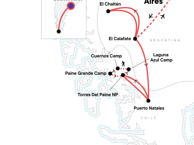 Your Welcome Moment: Welcome Moment - Meet Your CEO and Group. Laguna de los Tres full-day guided hike (El Chaltén). Kayak in Río de las Vueltas. Perito Moreno Glacier guided tour (El Calafate). Torres del Paine NP excursion with porters (3 nts). W Trek. Internal flights. All transport between destinations and to/from included activities.