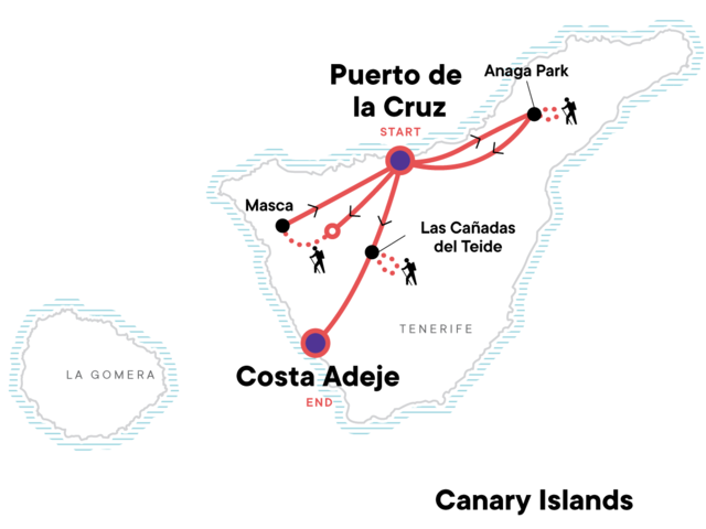 Explore the island of Tenerife, Hike Anaga's leafy laurisilva forests, Gaze out on the Mars-like landscape of Las Caãdas del Tiede, Bask in free time on the gold sand beaches of Costa Adeje, Hike from the village of Erjos to Masca.