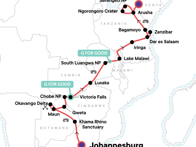 Now's the time to explore Africa on your terms with this tour that's affordable for young travellers. Tuck into a meaty month of adventure as you embark on an epic overland journey from Johannesburg to Nairobi, crossing the stunning wilderness of seven countries in between. Track Africa’s "big five" on safari drives in the Serengeti and Ngorongoro and head to the Okavango Delta for a wildlife walk and mokoro canoe excursion. Inhale the mists of Victoria Falls and the fragrant air of spice plantations in Zanzibar. You'll make your discoveries from a rugged Lando, ready to take on any adventure. Hop in for a ride you won't want to hop off.