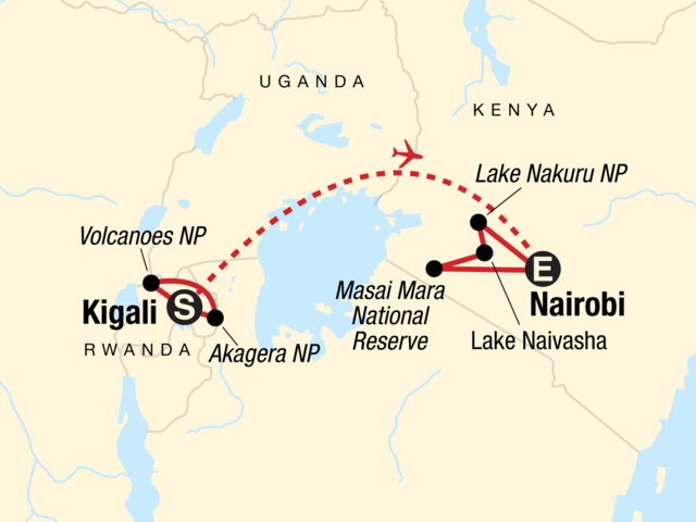 Your G for Good Moment: Nyamirambo Women's Centre, Local Lunch, Kigali. Arrival transfer. All national park entrance fees. Genocide memorial entrance. Mountain gorilla trek with permits. Golden monkey trek with permits. Local village walk. Safari drives in Akagera National Park. Wildlife boat cruise on Lake Ihema. Wildlife safari drives in Masai Mara National Reserve, and Lake Nakuru National Park. Boat trip on Lake Naivasha and wildlife walk on Crescent Island. Internal flight. All transport between destinations and to/from included activities.