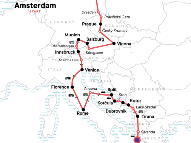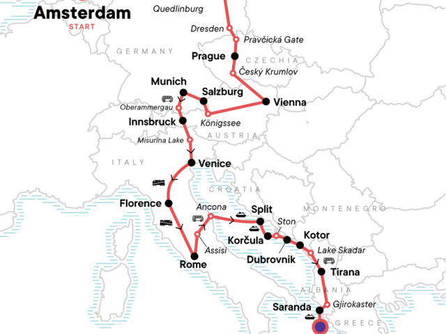 Most transport on this trip will be by private vehicle, except for when the group will take the train from Amsterdam to Berlin, Salzburg to Munich, Venice to Florence and Florence to Rome. They will travel by overnight ferry between Ancona and Split, then take a hydrofoil to Korcula and a ferry between Saranda and Corfu.