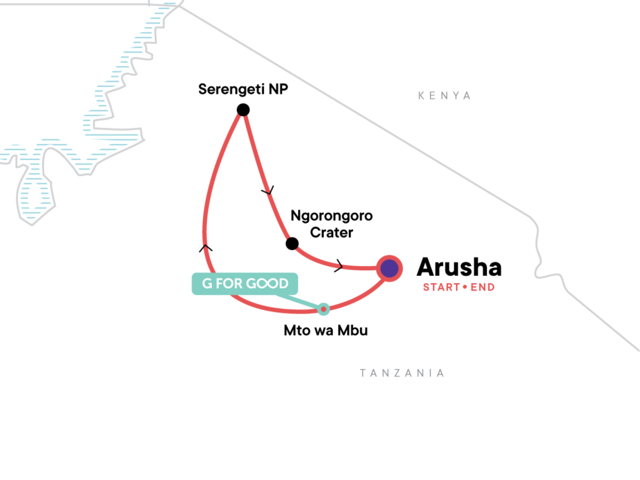 Your G for Good Moment: Mto wa Mbu Village Visit and Lunch, Mto wa Mbu. Olduvai Gorge Museum visit. Serengeti National Park entrance and wildlife safari drives. Ngorongoro Crater wildlife safari drive. All transport between destinations and to/from included activities.