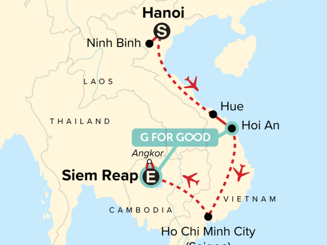 Hop on a bicycle taxi for an action-packed tour of Hanoi and Ho Chi Minh City. Float aboard a bamboo rattan boat in Tam Coc. Visit a tailor to get fitted for a shirt made especially for you in Hoi An. Cook up oodles of noodles at a G Adventures-supported training kitchen. Explore the awe-inspiring ruins of Angkor. Show off your acrobatic skills with a Cambodian circus.