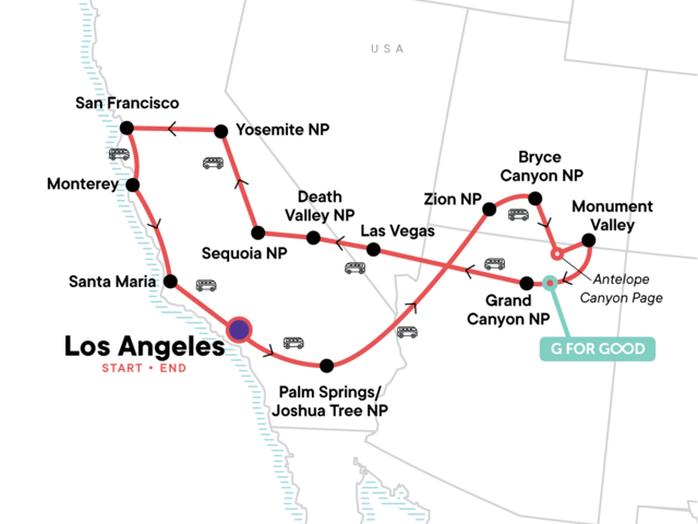 Your Welcome Moment: Welcome Moment - Meet Your CEO and Group. Joshua Tree National Park visit. Zion National Park visit. Bryce Canyon National Park visit. Horseshoe Bend and Antelope Canyon visits. Navajo guided Monument Valley jeep tour. Sunset along the rim of the Grand Canyon. Full day hiking in Grand Canyon National Park. Route 66 drive. Death Valley National Park visit. Sequoia National Park visit. Yosemite National Park visit. Entrance fees to all national parks and monuments with hiking and walking excursions. All transport between destinations and to/from included activities.