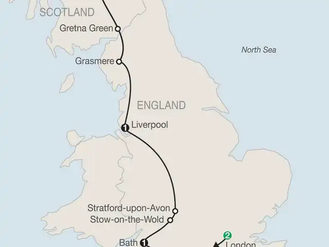 LONDONWelcome dinner; guided sightseeingSTONEHENGEVisit the prehistoric monumentBATHVisit the Roman relicsSTOW-ON-THE-WOLDTake a stroll in this Cotswolds villageSTRATFORD-UPON-AVONTake pictures of Anne Hathaway’s Cottage, visit Shakespeare’s birthplaceLIVERPOOLWalking tour through The Beatles quarterGRASMEREVisit Wordsworth’s villageEDINBURGHGuided sightseeing, visit Edinburgh Castle; farewell dinner at a local restaurant