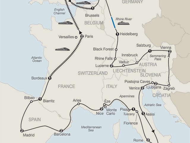 LONDONGuided sightseeing, visit St. Paul’s CathedralLONDON–BRUSSELS By high-speed Eurostar trainBRUSSELS Visit Grand’Place; [LF] enjoy a waffle and beer tasting at a local café; welcome dinnerAMSTERDAM Canal cruise; diamond centerRHINE CRUISE; HEIDELBERGTake pictures of the castleBLACK FOREST Hear about the art of woodcarving; RHINE FALLSLUCERNEWalking tour including the Lion Monument and Chapel BridgeVADUZ Visit the capital of LiechtensteinINNSBRUCK Walk to the Golden Roof SALZBURG[LF] A special dinner at Farmhouse Lenzenbauer; guided walking tour, visit Mirabell Gardens and Residenz Square VIENNAGuided sightseeing, visit Heldenplatz and Cathedral Square; admire the unusual Hundertwasserhaus ZAGREBGuided sightseeing; visit the cathedralLJUBLJANAGuided sightseeing, visit St. Nicholas’ Cathedral POSTOJNA[LF] Visit the Postojna Caves by mini-trainVENICEPrivate boat ride; guided walking tour, visit St. Mark’s Square & Basilica, Doges’ Palace and the Bridge of Sighs; glassblower demonstrationASSISIVisit St. Francis’ Basilica SORRENTO[LF] Excursion along the Amalfi Coast to Positano, taste a glass of Limoncello; excursion to Capri, including jetfoil boatride, funicular ride, and guided sightseeing POMPEIIGuided walking tour of the excavations ROME Guided sightseeing, visit the Vatican Museums and Sistine Chapel, St. Peter’s Square and Basilica, the Colosseum and Roman Forum FLORENCEGuided walking tour, visit Signoria Square; see Ponte Vecchio PISAMarvel at the legendary Leaning Tower ÈZEVisit a perfume factory ARLES Walk to the Roman AmphitheaterBARCELONAGuided sightseeing, visit the gothic quarter; take pictures of the Sagrada Familia Basilica MADRIDGuided sightseeing, visit the Prado Museum BILBAOVisit the Guggenheim MuseumBIARRITZOrientation BORDEAUXOrientation drive BORDEAUX–PARISBy high-speed TGV train (first-class) PARISGuided sightseeing, ascend the Eiffel Tower, [LF] farewell dinner at a local restaurant, followed by a drive through the “City of Light”PARIS–LONDONBy high-speed Eurostar TrainHeadsets throughout the tour