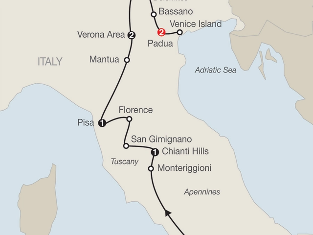 ROMEWelcome dinner at a local restaurant; guided sightseeing, visit the Colosseum and Roman Forum, the Vatican Museums and Sistine Chapel, St. Peter’s Square and BasilicaMONTERIGGIONI[LF] Taste cantucci alle mandorleSAN GIMIGNANOWalking tourFLORENCEGuided walking tour, visit Michelangelo’s David and Signoria SquarePISAMarvel at the legendary Leaning TowerMANTUA Guided sightseeing, visit Teatro BibienaVERONA Walking tour including Juliet’s balcony and the ArenaTRENTO OrientationBASSANO[LF] Taste the local grappa at the Poli Museo della Grappa PADUA OrientationVENICE Private boat ride; guided walking tour, visit St. Mark’s Square and Basilica, Doges’ Palace and the Bridge of Sighs; glassblower demonstration; [LF] farewell dinner at Al Colombo restaurant and a ride by private taxi boat through the Grand CanalHeadsets throughout the tour