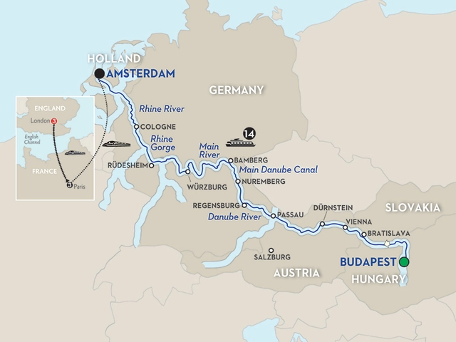 Cruise: deluxe 14-night cruise in an outside stateroom with Avalon’s exclusive Comfort Collection BedsSMDay 1 Budapest (Embarkation): welcome receptionDay 2 Budapest: guided sightseeing, see Fishermen’s Bastion and Heroes’ SquareDay 3 Bratislava: guided sightseeing, visit St. Martin’s CathedralDay 4 Vienna: guided sightseeingDay 5 Excursion to Göttweig Abbey–Dürnstein: guided visit of the Benedictine Abbey of Göttweig; guided walk in Dürnstein, see the Stiftskirche; wine tastingDay 6 Passau: guided walk in PassauDay 7 Regensburg: guided walk; enjoy a snack at the Historische Wurstküche; beer tastingDay 8 Nuremberg: choice of guided sightseeing or Nuremberg Rally Grounds tourDay 9 Bamberg: guided walk, see the Old TownDay 10 Würzburg: guided sightseeing, visit the Bishop’s ResidenzDay 11 Main River Village: guided walkDay 12 Rüdesheim–Rhine Gorge: visit Siegfried’s Mechanical Musical Instrument Museum; enjoy a special treat; cruise through the Rhine GorgeDay 13 Cologne: choice of guided walk or Jewish Heritage walkDay 14 Amsterdam: canal cruiseParis and London: 6 nights hotel accommodation with buffet breakfast (B); Monograms Local Host Service & Destination Guides with city maps; guided sightseeing, inside visits and special features are shown in UPPERCASE; high-speed Thalys train (firsit-class) from Amsterdam to Paris; high-speed Eurostar train (standard class*) from Paris to London (porterage available for one suitcase on Paris–London stretch only); transfers to/from train stations; discounts at the famous Galeries Lafayette department store in Paris.