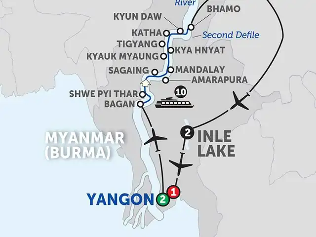 Day 1 Arrive Yangon: welcome to MyanmarDay 2 Yangon: walking tour of the city’s landmarks; visit a local tea shop, Chaukhtatgyi, and Shwedagon PagodaDay 3 Yangon–Bagan (Embarkation): fly to Bagan; onboard welcome reception; traditional puppet showDay 4 Bagan: watch sunrise from temple; sightseeing including a local market, Shwezigon Pagoda, lacquer workshop, Ananda Temple, Dhammayangyi Temple, Sulamani Temple; ox cart ride to temple for sunsetDay 5 Shwe Pyi Thar: walking tour through this typical river village to visit a farmer’s home and see palm candy being madeDay 6 Sagaing–Amarapura: visit Kaunghmudaw Pagoda, a silversmith workshop and Soon U Ponya Shin Pagoda in Sagaing; visit U Bein Bridge and take a sampan ride at sunset in AmarapuraDay 7 Mandalay: sightseeing including Mahamuni, Kuthadaw and Shwenandaw Pagodas; visit tapestry, woodcarving, and gold leaf workshops; traditional dance performanceDay 8 Kyauk Myaung: walking tour through a pottery-making villageDay 9 Kya Hnyat: visit a monastery and present alms to the monks and see their lunch ritualDay 10 Tigyang: walking tour through village and walk to hilltop pagodaDay 11 Katha: visit to local market; excursion to a local ethnic minority villageDay 12 Kyun Daw–Second Defile: visit a fisherman’s home, local school, and nunnery in Kyun Daw; cruise through the dramatic second defileDay 13 Bhamo (Disembarkation)–Heho–Inle Lake: explore Bhamo by trishaw and foot; fly to Heho; transfer to Inle Lake; lunch at Red Mountain EstateDay 14 Inle Lake: full-day excursion around the lake to see scenes of daily life; visit workshops of several cottage industries; Padaung music & dance performanceDay 15 Inle Lake–Heho–Yangon: transfer to Heho; fly to Yangon Day 16 Yangon: your vacation ends